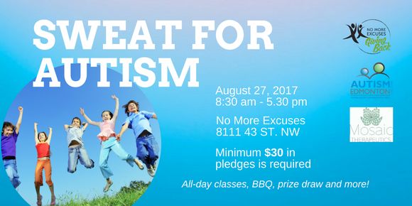 Join us for our Sweat for Autism, a marathon-style fitness fundraiser that will be held on August 27, 2017 at the No More Excuses fitness studio (8111 43 St NW, Edmonton), with events running from 8:30 am until 5:30 pm. Along with fitness challenges, there will also be BBQ from 11:30 am to 2:00 pm, massages available on-site for participants, and prizes for the top three fundraisers (1st prize valued at $500+, 2nd prize valued at $300+, and 3rd prize valued at $200+). Keynote speakers and VIP introductions will take place during the BBQ.
