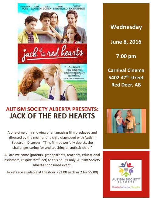I am very happy to say that I am not dreading Grade 2, because I now know what we need to do to be prepared for the new school year. I’ll update my “All About Me” folder and letters to staff and parents. Over the summer break we will continue to work on academics (a little every day), keep a bit of a schedule, attend a summer camp, and continue to work on social skills and regulation. But we will always keep in mind that he still needs to enjoy his summer and have fun, just like any other child.Central Alberta Movie Showing: Jack of the Red Hearts
